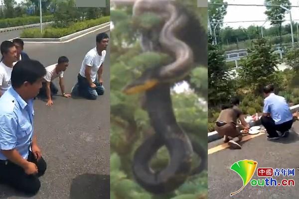 中国青年网北京6月1日电(记者 李永鹏 实习记者 蒋艳慧)近日,一则“驾校端午节雨后现大蛇盘树,多名制服人员焚纸跪拜”的视频在网上流传,引发网友热议。据中国青年网记者了解,当日恰逢端午“毒日辟邪”的日子,人们发现大蛇后无人敢上前将其撵走,于是众人烧纸跪拜欲“送走”大蛇。
