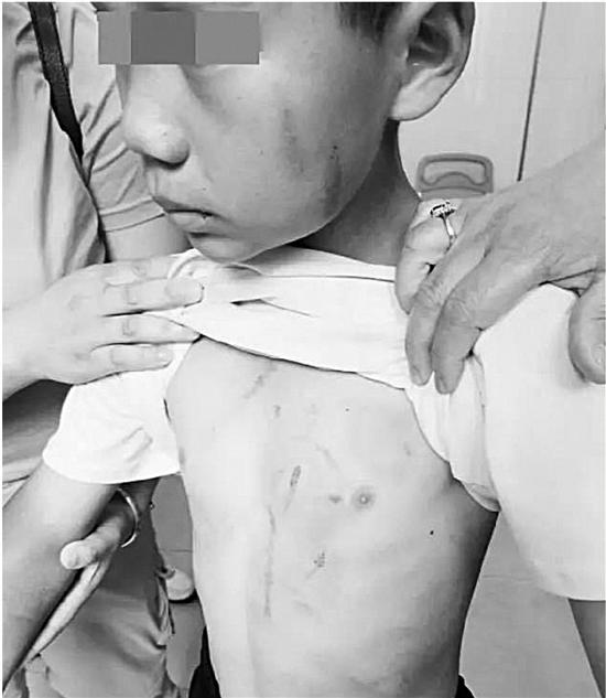 13岁的小男孩小靖(化名)身上都是伤痕。