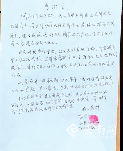 “等待电话接通的短短几秒,对于我来说无比煎熬,且不说这块表价值几万元,这也是家人送我的礼物,很有纪念意义,要是丢了我会很自责。”孙先生告诉记者,电话接通后,出租车司机的回复让他的心凉了半截:因为忙着拉生意,司机没注意后排座位上有没有东西,回到昆明后,他接连拉了几单生意。“当时我非常沮丧,游玩的心情都没有了。但司机说会再帮我找找看看,只是我没抱太大希望。”