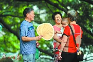 昨日,东湖公园,老人为孩子扇风纳凉。广州日报全媒体记者骆昌威 摄
