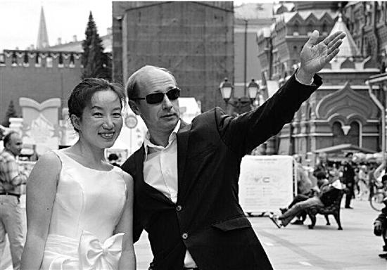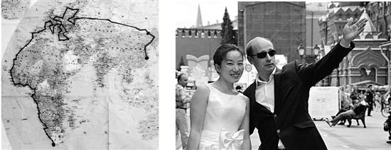 左图:环游25国的线路图。 右图:赵菊阳穿着婚纱与俄罗斯大叔合影。