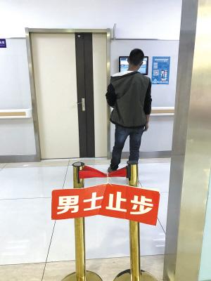 仍有男士无视止步牌,进入妇产科候诊区 。记者王娜