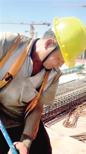 在体育场A2施工现场,10多名钢筋工正在忙着绑扎钢筋。来自平顶山市郏县的李新杰今年45岁,大热天还穿着一件长袖衬衣。他说近期气温太高了,穿长袖衬衣可避免皮肤晒伤,身上的汗水一阵一阵的,干活时整个衣服湿透了,但绑扎钢筋多在楼顶,不时能吹一阵热风,衬衣便湿了干,干了湿。