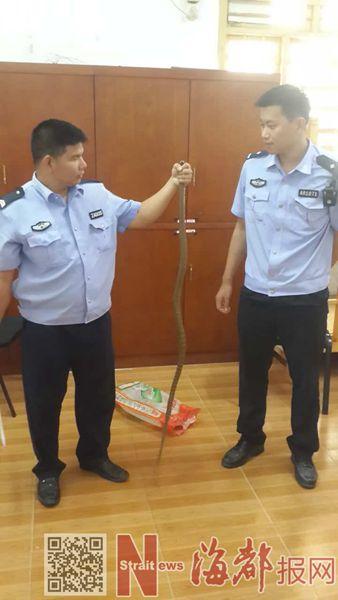前天下午1点多,南安仑苍派出所民警接到村民洪先生打来的求助电话,称家中来了不速之客,一条长1.4米左右的蛇盘踞在客厅。民警立刻联系当地的捕蛇人,赶到洪先生家中。
