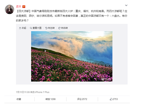 “【四大凉都】中国气象局刚刚发布最新版四大火炉:重庆、福州、杭州和南昌。而四大凉都呢?应该是贵阳、西宁、哈尔滨和昆明。如果不考虑省会因素,真正的中国凉都只有一个:六盘水。有你家乡吗?”7月11日,国内著名综艺节目主持人孟非发布这条微博,同时还配发了一张“贵州最高峰——韭菜坪”的照片。网友则纷纷在下面留言,有的说六盘水美味的水城烙锅和羊肉粉,有人说到六盘水的夏季马拉松,也有人表示“现在六盘水午睡还盖棉被”。