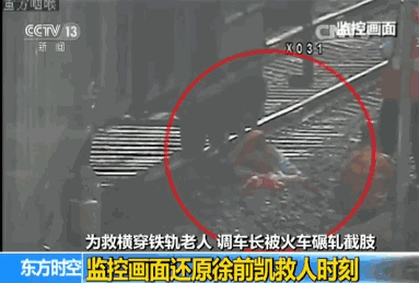 监控画面:徐前凯将老人推出铁轨 自己右腿却来不及抽出