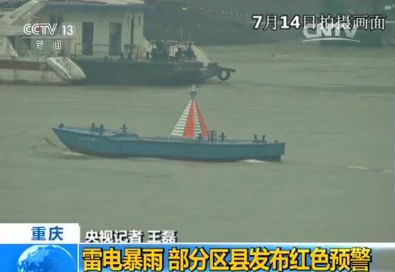 央视记者 王磊:从今天凌晨开始,重庆市气象台相继发布了强对流天气预警和雷电黄色预警,现在是早上7点, 我现在所在的位置是重庆的南滨路。目前雨势还是比较大,我身后是就是长江和嘉陵江的交汇处,和平时相比,江面上水流的速度明显增快。