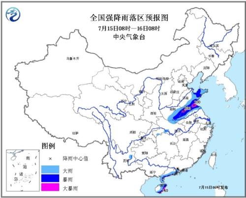 7月15日电 据中央气象台网站消息,中央气象台7月15日6时发布暴雨蓝色预警:预计,7月15日8时至16日8时,黄淮大部、海南岛中东部、广东西部沿海地区等地有大到暴雨,其中,安徽北部、山东南部、江苏北部、海南岛东南部沿海地区局地有大暴雨(100~140毫米);最大小时雨强可达30~50毫米,局地超过70毫米。