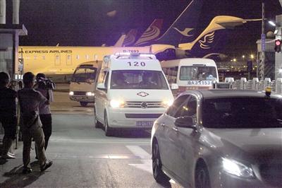 15日凌晨,载着杨婷的救护车驶出停机坪。