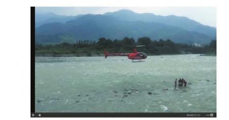 都江堰河水猛涨困住8人 直升机往返3次悬停救人