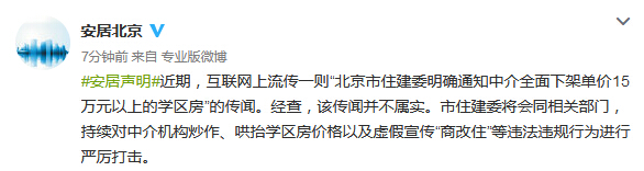日期:03-30 来源:北京住建委官方微博消息,近期,互联网上流传一则“北京市住建委明确通知中介全面下架单价15万元以上的学区房”的传闻。经查,该传闻并不属实。