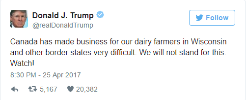 日期:04-26 来源:美国商务部长罗斯(Wilbur Ross)25日在接受CNBC采访时谴责了加拿大的贸易保护主义行为,但表示美国对加拿大软木征收关税并非贸易战开始的信号;同时,特朗普总统警告可能会对加拿大乳制品征收进口税。