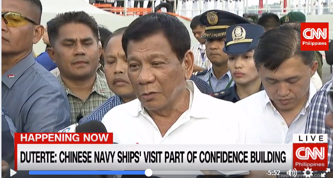 杜特尔特表示,中国军舰的访问是中菲关系建立信心的一部分,并称中菲有可能在苏禄海举行联合演习。