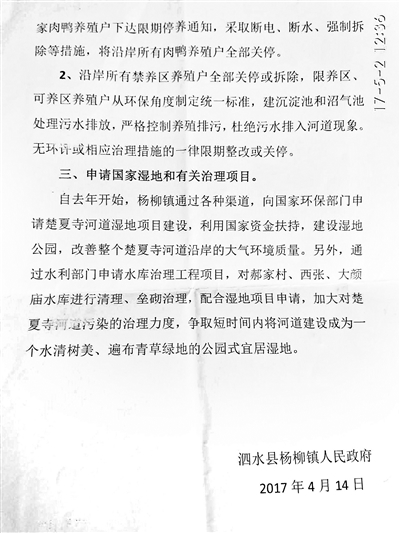 李森最终收到的这封信,内容是标题为《关于杨柳镇楚夏寺河道治理的情况说明》的“文件”,共两页。该《情况说明》介绍,楚夏寺河是泗河支流,几年前曾遭遇污染,2016年上半年开始,杨柳镇党委政府从加大对沿岸企业排污治理力度、严控沿岸畜禽养殖污染等方面加强了河道污染的治理力度。文中并未提到举报的甘薯食品加工企业。这份《情况说明》的落款为“泗水县杨柳镇人民政府,2017年4月14日”,但并没有盖公章。
