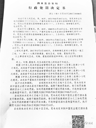 《泗水县公安局行政处罚决定书》显示,三名打人者都是杨柳镇孔家村人,为首的是一名46岁男子,此人姓名正是“刘玉成”。(文中部分人物为化名)