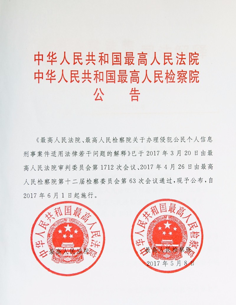 5月9日上午10时,最高人民法院召开关于《最高人民法院、最高人民检察院关于办理侵犯公民个人信息刑事案件适用法律若干问题的解释》的新闻发布会。最高人民法院新闻发言人林文学主持新闻发布会,最高人民法院研究室主任颜茂昆通报了相关情况,最高人民法院研究室主任颜茂昆、最高人民检察院法律政策研究室副主任缐杰、公安部网络技术研发中心主任许剑卓回答了记者提问。