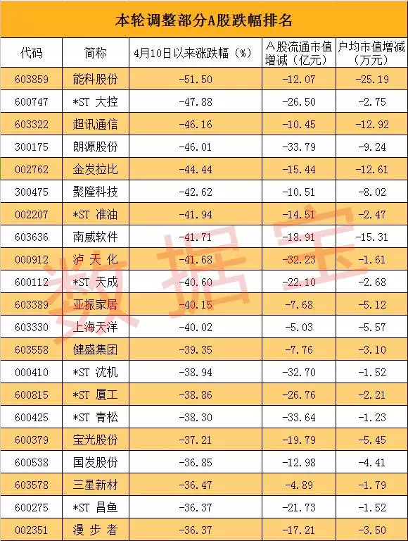 数据宝统计显示,能科股份、温氏股份、南威软件、超讯通信、金发拉比、世纪游轮等6股户均流通市值蒸发均超过10万元,能科股份户均流通市值蒸发达25万元居首。能科股份户均市值缩水25万元是这么计算来的,A股流通市值合计缩水12.07亿元,前十大流通股东持有流通股比例17.86%,无高管持有流通股,则其他普通投资者市值缩水为9.9亿元左右,再除以季报股东户数(3946-10),得到结果25万元。