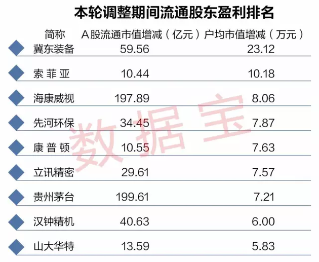 有亏损的也会有盈利的。数据显示,冀东装备给投资者带来的市值增长最大,户均市值增长达到23万元;索菲亚排名第二位,市值增长达到10万元。此外,海康威视、先河环保、康普顿等10股普通投资者市值增长均超过5万元。