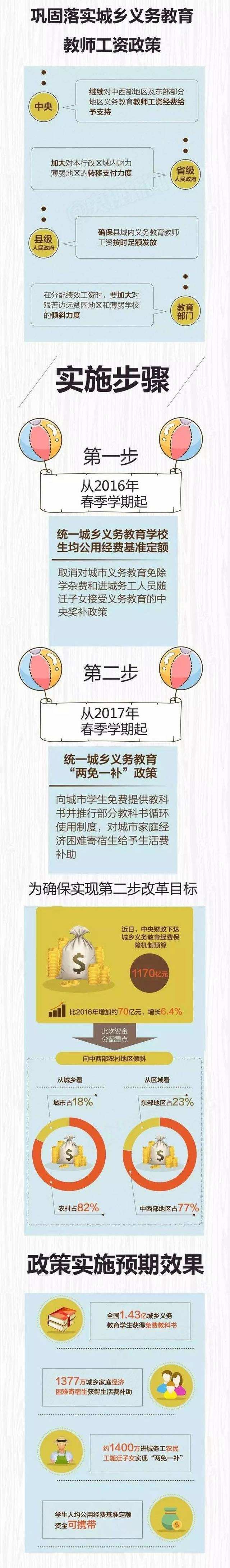 日期:05-14 来源:2017年,中央财政下达城乡义务教育经费保障机制预算1170亿元,这比2016年增加了约70亿元,增长6.4%,以确保实现《国务院关于进一步完善城乡义务教育经费保障机制的通知》的第二步改革目标。这千亿元预算要怎么花?谁将从中受益?赶快看看!