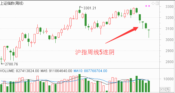 再看调整的时间,大盘已经连续调整一个多月,期间没有出现过任何像样的反弹,沪指周线已经出现五连阴的走势。同时,现在大盘又处于3000点关口的敏感区域,所以我个人认为,从沪指周线看,市场在此处短线企稳的概率是很大的。