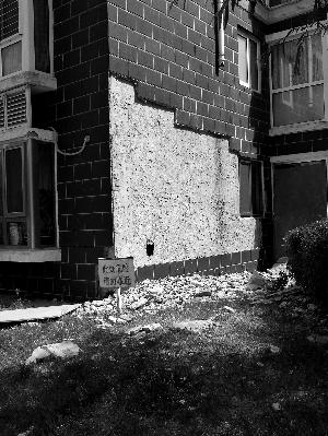 近日,北京晨报记者来到新华联家园北区9号楼,在楼体西侧看到两处脱落,下面有一块四五平方米的墙砖脱落,而该楼7层到9层的外墙面,还有一处出现脱落,面积更大,约有20平方米,墙体水泥层已经裸露在外。
