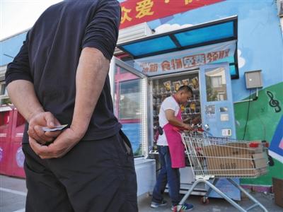 昨日,顺义众爱慈善商店门口,工作人员在为“智能分享冰箱”装填免费食物,一旁的男士持卡准备领取。新京报记者 王嘉宁 摄