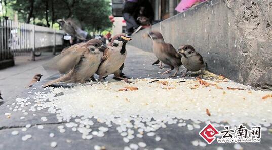 孔霖辉说:“几天后,我发现店外有几只麻雀来捡拾我家狗吃剩的东西,十分可怜。想起以前昆明城周边都有稻田,麻雀不愁吃,现在麻雀在城里生存困难,我就拿出一些米来喂它们,它们也不客气,见了就吃。一来二去,我们就熟了。”