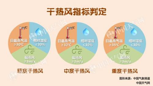 另外,高温晴热天气下,今明天河北中南部、河南北部部分地区,将出现中到重度干热风,各地应积极进行“一喷三防”工作,注意防范和减轻“干热风”对小麦生产的危害。