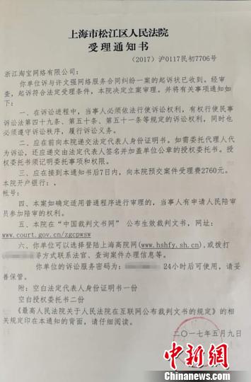 阿里巴巴将销售假五粮液酒的“90后”售假商家许某某及其合伙人诉至法庭,索赔10万元并要求公开致歉。图为该案件的受理通知书。供图