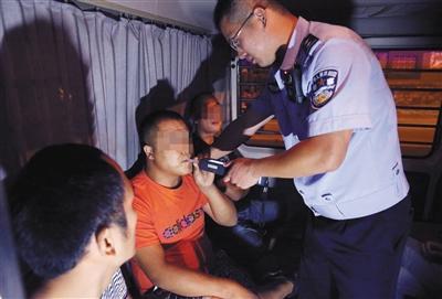 2016年7月28日晚,朝阳交通支队双桥大队民警正对几名涉嫌酒驾的司机进行酒精检测。资料图片/新京报记者 尹亚飞 摄