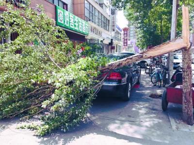 据了解,事发地点位于太原街、南四马路交会处东侧。在一家生活超市门口,路旁一棵粗大的树被拦腰刮折,碗口粗的树干及茂盛的枝叶将旁边停放的一辆轿车砸中。据悉,这辆车是辉腾,价值近百万元。车的后尾处被砸出一个坑,车体多处被树枝划出痕迹,据目测修车费用至少数千元。