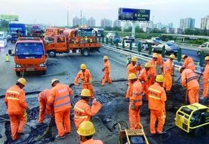 北京晨报记者在事发路段看到,沥青桥面开裂隆起,长度达到三条车道,仅剩应急车道可通行。路政部门的施工人员正在现场紧急抢修。此外,交警也在现场对车辆进行疏导。