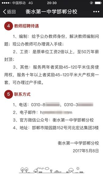 衡水一中邯郸分校50万年薪招教师引争议 已收多
