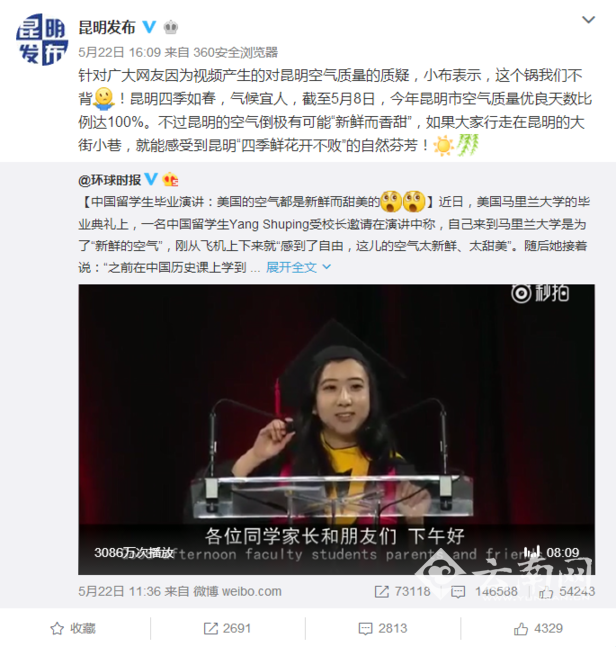 云南网讯(记者 熊强 赵岗)5月22日,一段中国女留学生在美国马里兰大学毕业典礼上发表毕业演讲的视频引发轩然大波。视频中该女留学生声称美国的空气“新鲜而甜美”,并且说自己在家乡时每天出门都要戴口罩。另有网友发现该留学生的微博个人资料显示其家乡是昆明。