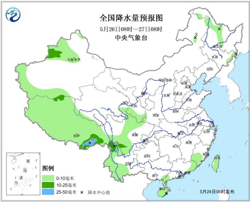 26日08时至27日08时,全国大部无明显降水。东北地区东部、新疆北部、西藏、四川西部和南部、云南西部、海南岛等地有小到中雨,西藏东南部局地有大雨(见图3)。