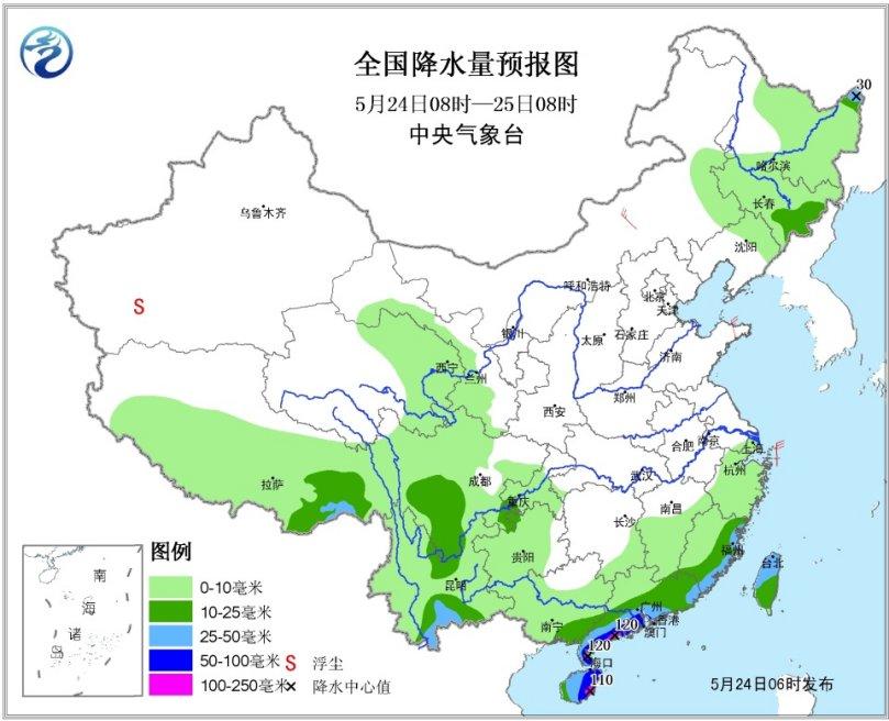 华南等地降水趋于减弱。随低涡切变系统东移入海,华南等地暴雨范围减小,强度减弱,为此,中央气象台5月24日06时解除暴雨蓝色预警。但5月24日08时至25日08时,福建东部、广东中部和西部沿海、雷州半岛、海南岛东部等地仍有大雨,广东西部沿海、雷州半岛、海南岛东部等地的部分地区有暴雨,局地大暴雨(100~120毫米)。
