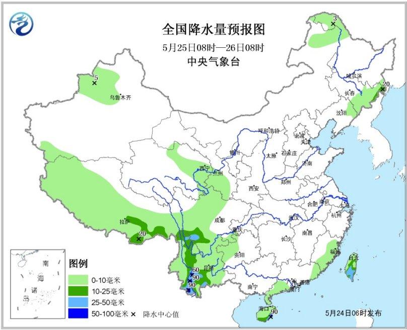 25日08时至26日08时,全国大部无明显降水。东北地区北部和东部、西藏、四川西部和南部、云南、海南岛等地有小到中雨,云南南部、海南岛东部等地的部分地区有大雨,局地暴雨(50~90毫米)(见图2)。渤海有6~8级风、阵风9级。