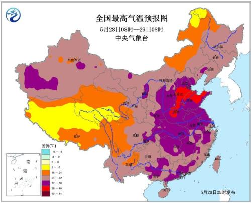 预计端午假期前期,华北黄淮有高温天气,其中28日高温范围最大,中东部大部地区气温都将在32℃以上,北京、河北、山西、河南、山东等地的部分地区最高气温可达35~37℃;28日夜间至30日,华北中北部、东北地区有小雨或阵雨,华北、黄淮高温天气结束。