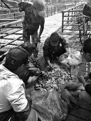 日期:05-27 来源:近日有市民爆料称,亮马河新源街段不时有人“放生”大量泥鳅、小龙虾等。昨日,北京晨报记者在现场了解到,几乎天天有人在此处放生,泥鳅、黄鳝、田螺、河蚌、甲鱼、乌龟等,种类繁多。河道北岸有市民在放生泥鳅,而桥畔和南岸有人直接捕捞,大获“丰收”。北京市渔政监督管理站工作人员表示,放生需在有关部门监督下进行,随意放生危害生态系统涉嫌违法。