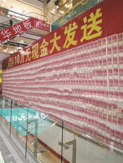 记者赶到该卖场看到,“10万元现金大发送”几个黄色大字下面,满眼都是百元大钞,一旁围了众多市民。据目测,“大钞墙”长5米左右,高2米多。宣传海报显示,凡是定购两个品牌的顾客都可以参与平分10万元现金,定2单分一次,定4单分两次,以此类推。