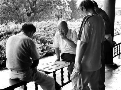 在天坛公园边吸烟边下棋的游客 本版摄影/本报记者 魏彤