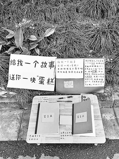 北青报记者看到,杨冰倩在摊位上准备的纸板上写着:“嗨,陌生人!今天是我20岁生日,我将买生日蛋糕的钱换成硬币,愿意送你一块‘蛋糕’,但作为交换,你必须送我一条关于20岁的忠告或者一个你的故事,并保证绝对真实。写在旁边的本子上吧!”
