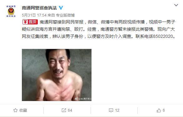 6月1日,江苏南通警方发布消息称,目前没有暂未接报此类警情。为了尽快核实视频中男子身份,警方现向广大网友征集线索,辨认该男子身份以便警方及时介入调查。