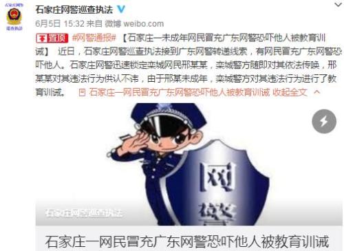日期:06-07 来源:中新网6月6日电石家庄市公安局网络安全保卫支队官方微博5日发布通报,称有网民假冒广东网警恐吓他人称对方涉嫌诈骗,要求其三天内到公安局自首,并关闭全部网站。石家庄网警迅速锁定嫌疑人石家庄市栾城区邢某某,由于其尚未成年,栾城警方对其教育训诫。