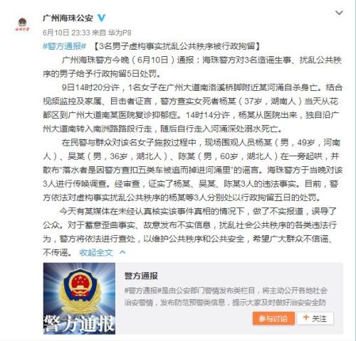 据通报,在民警与群众对该名女子施救过程中,现场围观人员杨某(男,49岁,河南人)、吴某(男,36岁,湖北人)、陈某(男,60岁,湖北人)在一旁起哄,并散布“落水者是因警方查扣五类车被追而掉进河涌里”的谣言。海珠警方于当晚对该3人进行传唤调查。经审查,证实了杨某、吴某、陈某3人的违法事实。目前,警方依法对虚构事实扰乱公共秩序的杨某等3人分别处以行政拘留五日的处罚。