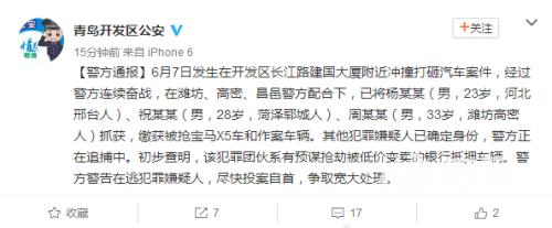 @青岛开发区公安【警方通报】,6月7日发生在开发区长江路建国大厦附近冲撞打砸汽车案件,经过警方连续奋战,在潍坊、高密、昌邑警方配合下,已将杨某某(男,23岁,河北邢台人)、祝某某(男,28岁,菏泽郓城人)、周某某(男,33岁,潍坊高密人)抓获,缴获被抢宝马X5车和作案车辆。其他犯罪嫌疑人已确定身份,警方正在追捕中。初步查明,该犯罪团伙系有预谋抢劫被低价变卖的银行抵押车辆。警方警告在逃犯罪嫌疑人,尽快投案自首,争取宽大处理。