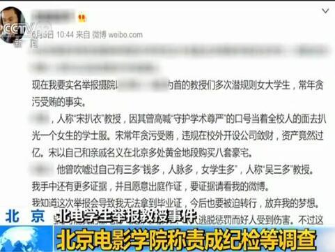 日期:06-11 来源:近日,一名自称是北京电影学院学生的网友,通过微博发文,举报北京电影学院摄影学院相关老师存在师德师风和经济问题,称被举报人有潜规则大学生、常年收受贿赂等行为。