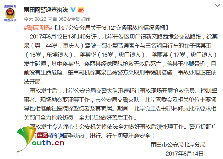 2017年6月12日13时40分许,北岸开发区忠门镇新文路西埭公交站路段,徐某泉(男,44岁,重庆人)驾驶一部小型普通客车与三名骑自行车的女子蒋某玉(16岁,东埔镇人)、蒋某华(16岁,忠门镇人)、蒋丽某(17岁,忠门镇人)发生碰撞,其中蒋某华、蒋丽某经送医院抢救无效后死亡;蒋某玉小腿骨折,目前没有生命危险。肇事司机徐某泉已被警方采取刑事强制措施,事故处理正在依法开展。