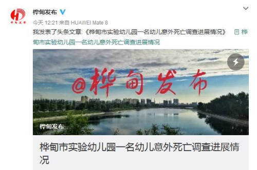 日期:06-16 来源:6月15日电 据吉林省桦甸市互联网信息中心官方微博“桦甸发布”消息,6月12日,桦甸市实验幼儿园一名幼儿意外死亡。公安机关正在展开深入调查,涉事教师已被停止工作,接受调查。